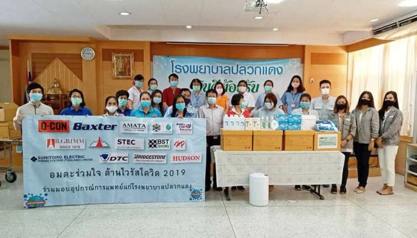 Amata City Rayong Company Limited, in collaboration with the Amata Volunteer Club and more than ten manufacturers of Amata City Rayong Industrial Estate, provided cash to buy needed medical supplies, including sanitary masks, Personal Protective Equipment (PPE), 95-percent mercury gel and other products valued at 150,000 Baht.