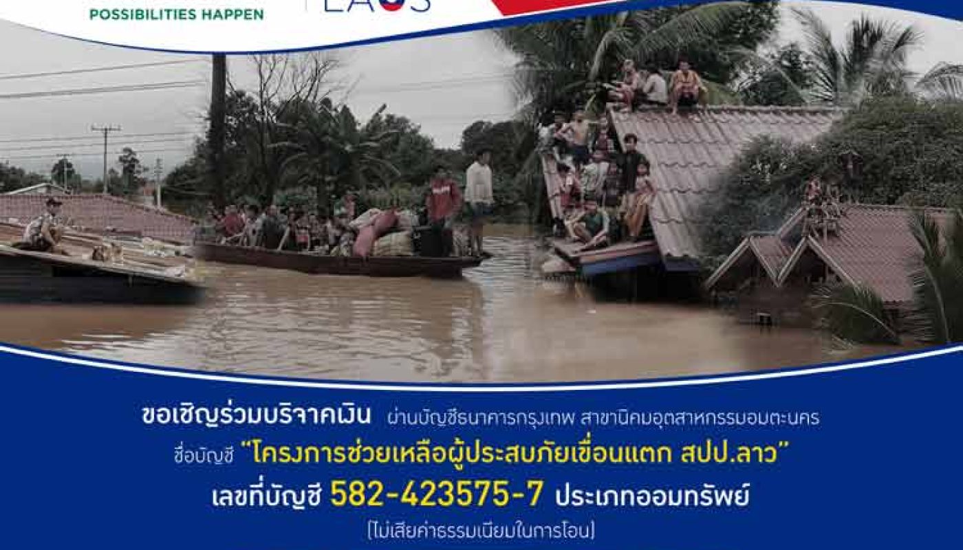 The collapse of a hydroelectric dam that was under construction in the southern province of Attapeu leaves hundreds missing and homes washed away. The tragic incident that happened Monday forced thousands of people to flee their homes and caused severe shortages of food and necessary supplies. Amata asks customers and stakeholders to join hands by donating money, which will be used to purchase food and goods.