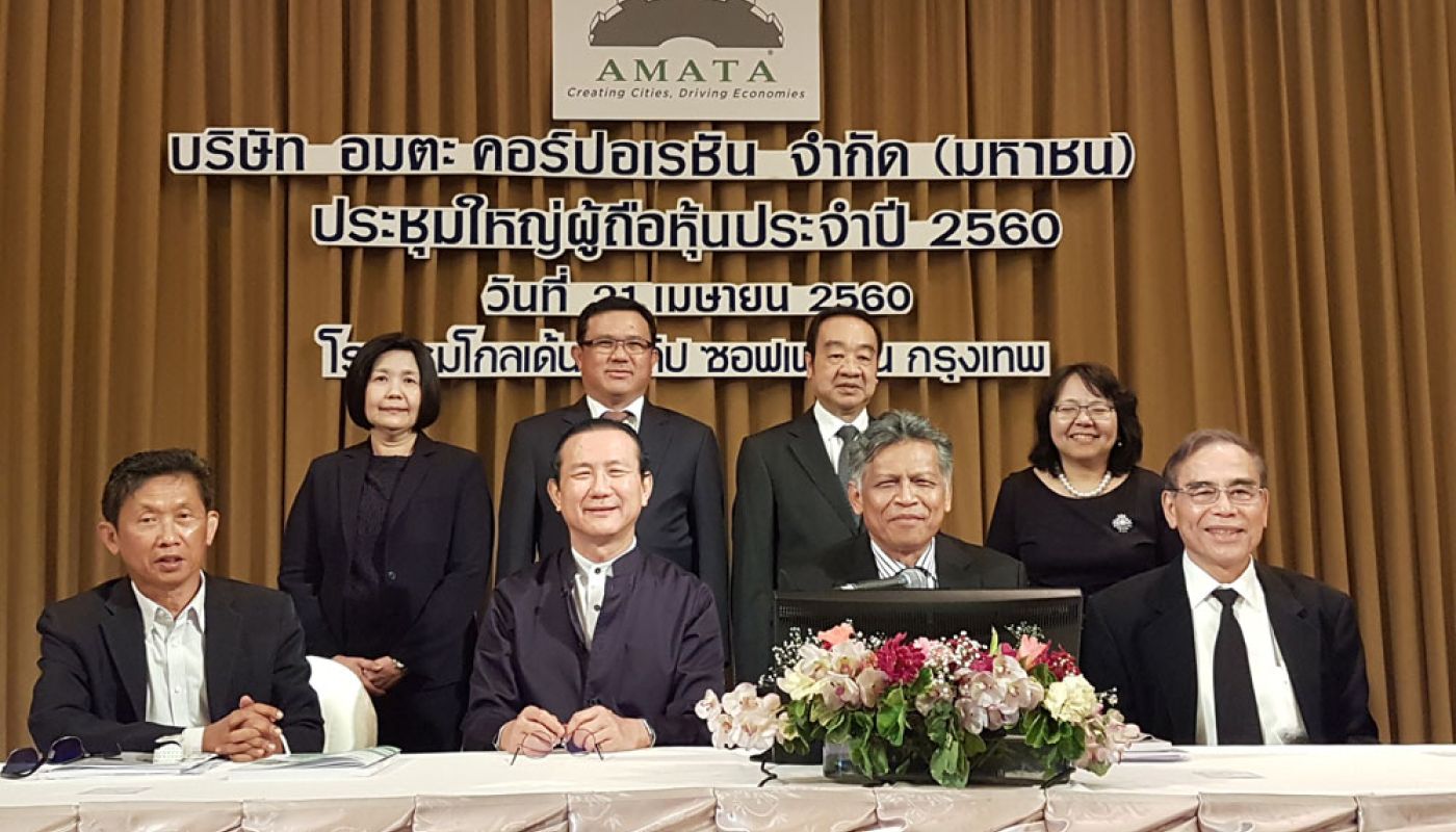 Dr. Surin Pitsuwan, Chairman of Amata Corporation PCL. alongside Vikrom Kromadit, CEO (both seated, center) and other Members of the Board presided over the annual shareholder’s meeting at Golden Tulip Hotel in Bangkok.