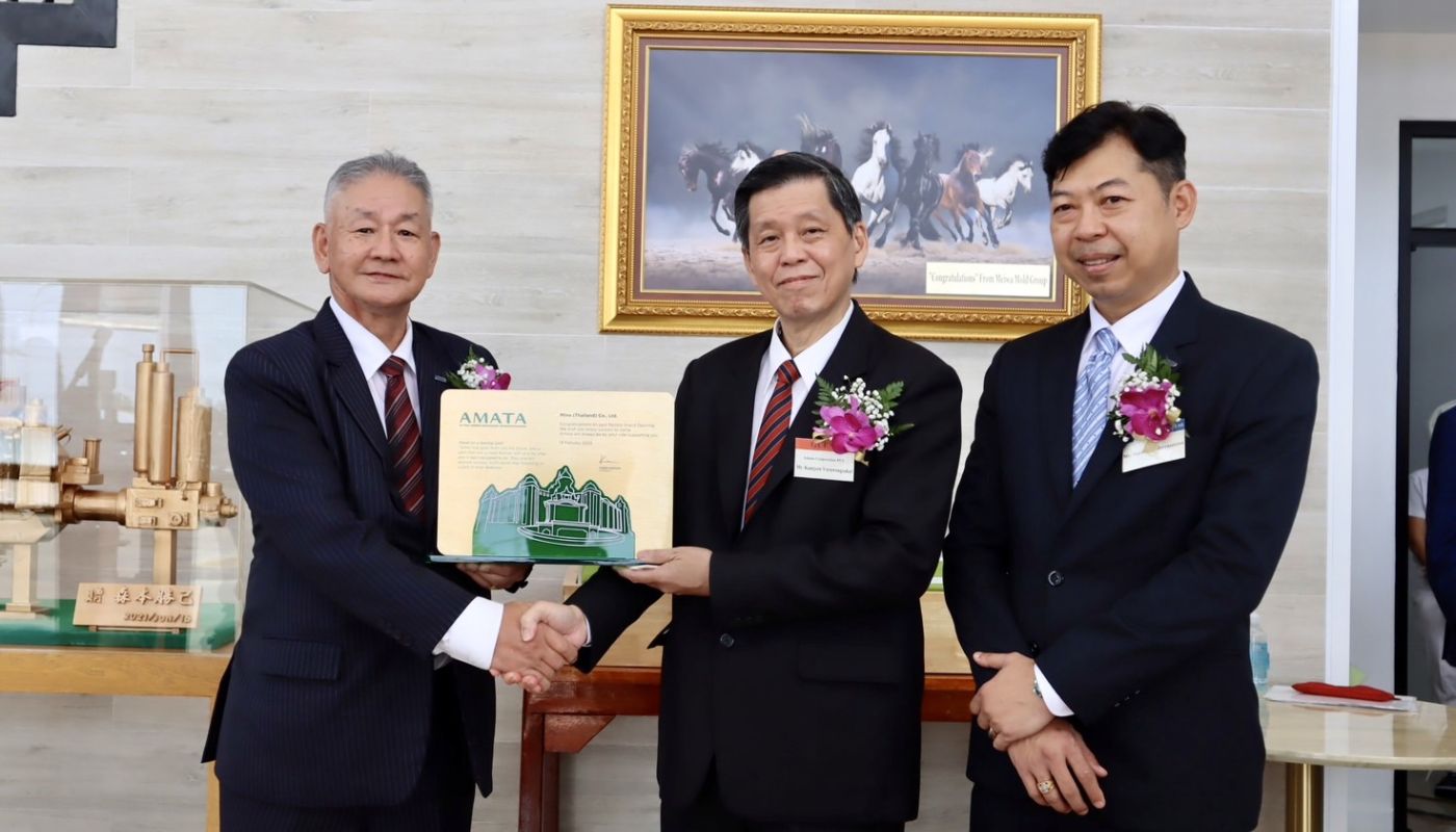 Mino (Thailand) Company Limited, a Japanese company of automotive parts and aluminum injection molding, celebrated the grand opening of its new factory expansion in Amata City Chonburi industrial estate. Mr. Kamjorn Vorawongsakul, Executive Advisor, represented Amata Corporation at the ceremony and presented a congratulations plate to Mr. Katsumi Morimoto, President of Mino (Thailand).
