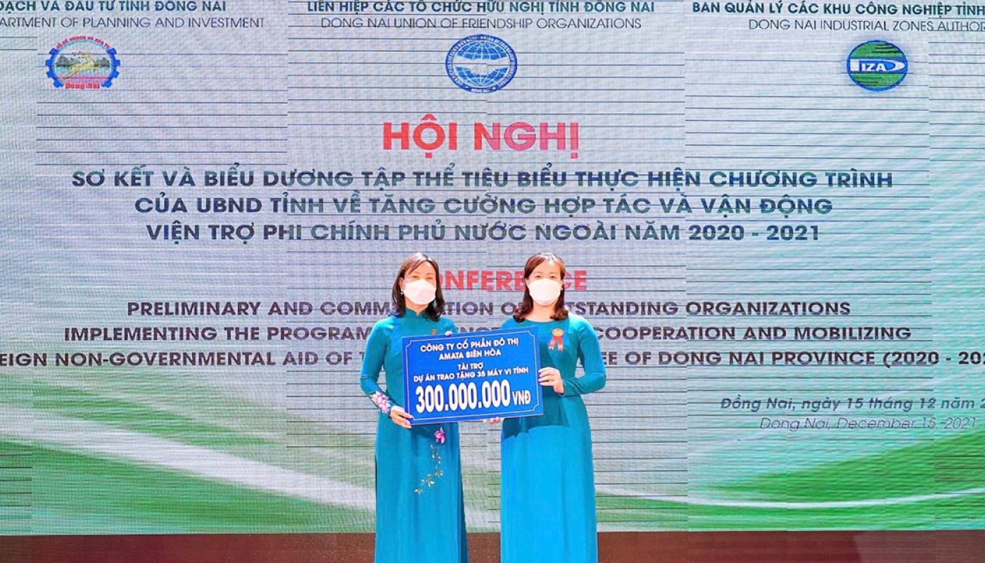 During the conference organized by Dong Nai Union of Friendship Organization (DUFO), Amata customer Suntory Pepsico Company also received an award for its donation of computers and a water filter machine to Long Binh Junior High School earlier in 2021.