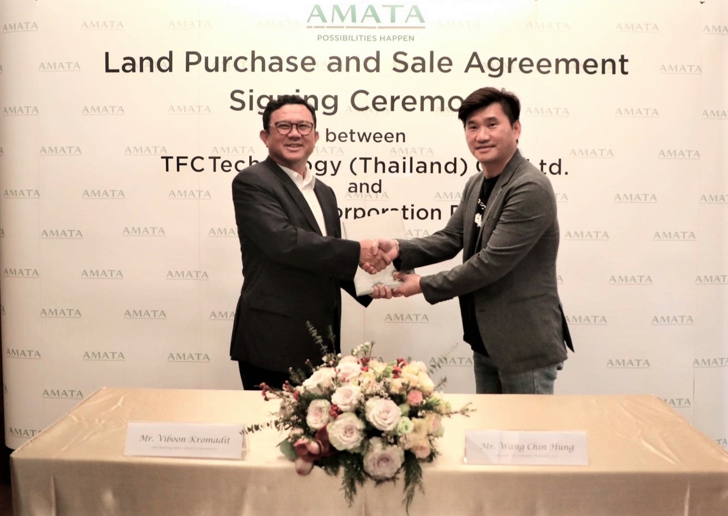 Mr. Wang Chin Hung, Chairman of TFC Technology (Thailand) Co., Ltd. (second left in above picture) and Mr. Viboon Kromadit, Director and Chief Marketing Officer of AMATA Corporation Public Company (far left) signed a land purchase and sale agreement to establish a new factory at AMATA City Chonburi industrial site. TFC Technology's business is in the production, design and import and export of automotive parts, sensor, electronic and optical equipment as well as research and development of biomedical equipment and technical consulting services. It is the local entity of TFC Communication with headquarters and R&D Center in Suzhou, Jiangsu province, China.